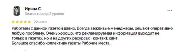 Сказать что-то негативное в отношении газеты «Рабочие места» просто невозможно. Отзывчивые менеджеры, действительно работающее издание! А что еще необходимо для длительного и полноценного сотрудничества?