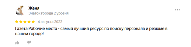 Я очень довольна сотрудничеством с газетой «Рабочие места». За две недели к нам пришло больше 50 резюме, соответственно нам удалось провести полноценный конкурс и принять на работу действительно лучших. Также радует оперативность и отзывчивость сотрудников газеты. Разумные цены, высокая эффективность, качественный сервис – именно эти характеристики я отметила, оценивая газету «Рабочие места».
